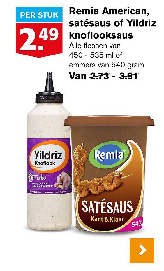 Bekijk nu de Remia American, satésaus of Yildriz knoflooksaus aanbieding in de Hoogvliet folder. Deze aanbieding is geldig van 26-03-2025 tot en met 01-04-2025.