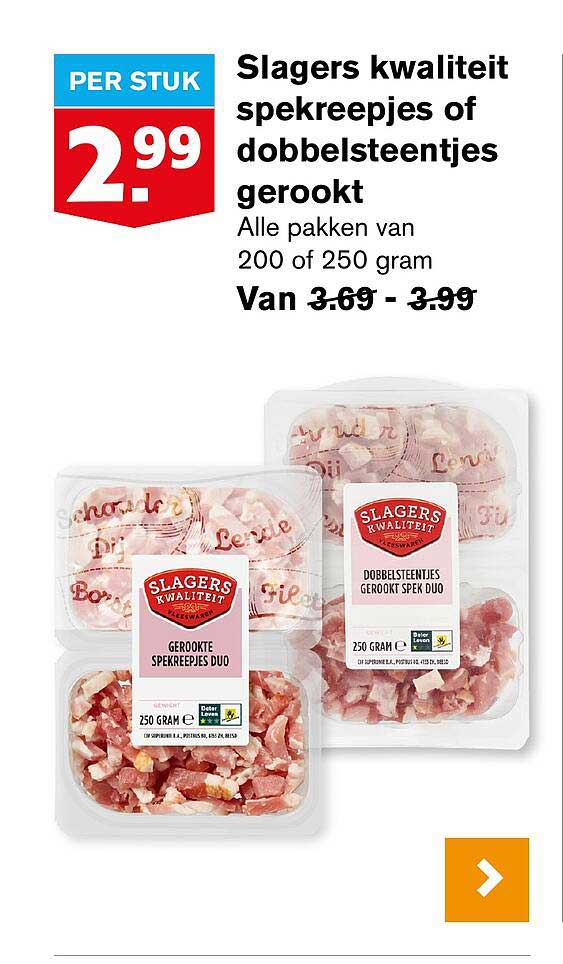 Ben je een fan van spek? Dan hebben we geweldig nieuws voor je! Op deze pagina vind je een fantastische aanbieding voor Slagers kwaliteit spekreepjes of dobbelsteentjes gerookt. Deze heerlijke spekjes zijn perfect voor allerlei gerechten, van salades tot omeletten en meer. Geniet van de rijke, rokerige smaak voor een schappelijke prijs. Deze aanbieding is geldig van 26 maart tot en met 1 april 2025, dus zorg ervoor dat je snel je voorraad aanvult!