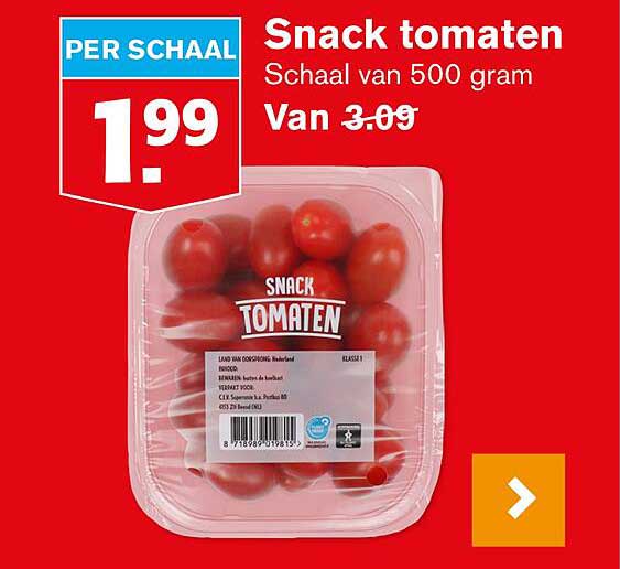 Bekijk de Snack Tomaten aanbieding bij Hoogvliet! Deze fantastische aanbieding is nu beschikbaar in de nieuwste Hoogvliet folder. Profiteer van deze kans en bespaar flink op je aankoop.