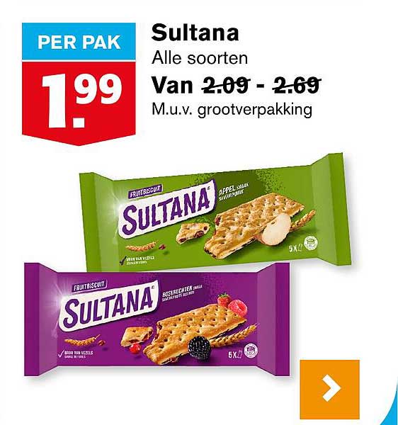 De reguliere prijs voor Sultana varieert van €2,09 tot €2,69, maar nu kan je ze voor slechts €1,99 per pak kopen. Dit betekent een directe besparing en de mogelijkheid om meer te genieten van deze heerlijke snacks zonder je portemonnee te pijnigen. Een uitstekende gelegenheid om je voorraad aan te vullen!