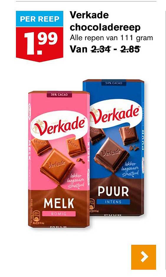 Bekijk de Verkade Chocoladereep aanbieding bij Hoogvliet! Deze fantastische aanbieding is nu beschikbaar in de nieuwste Hoogvliet folder. Profiteer van deze kans en bespaar flink op je aankoop.