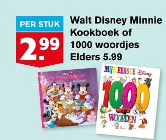Ben je op zoek naar een geweldige deal voor de kleintjes? Kijk dan niet verder! Deze aanbieding van Hoogvliet biedt het Walt Disney Minnie Kookboek of het boek '1000 woordjes' aan voor slechts €2,99 per stuk. Normaal gesproken betaal je elders maar liefst €5,99. Dit is hét moment om de fantasie van je kinderen een flinke boost te geven met deze kleurrijke en educatieve boeken.
