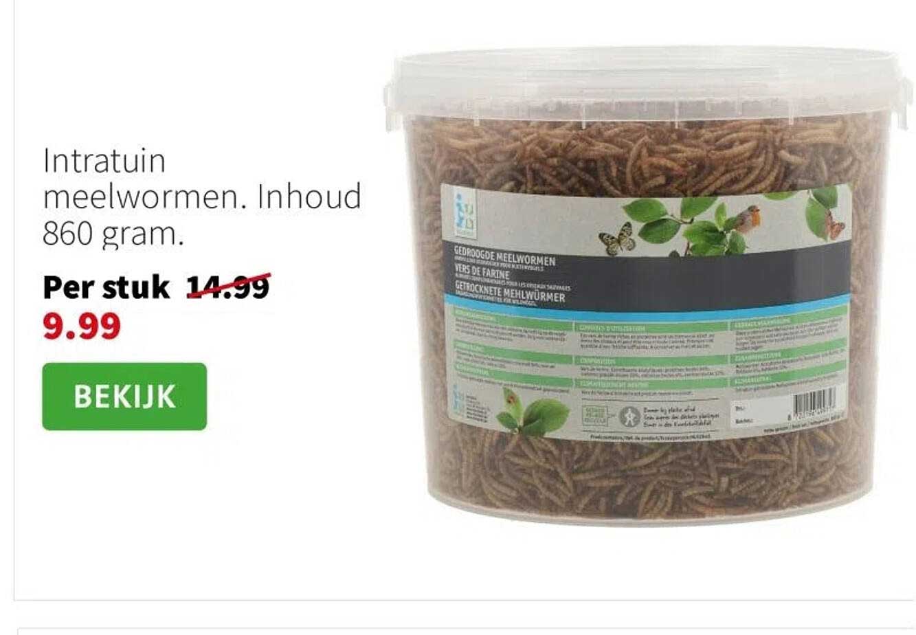 Bekijk nu de Intratuin meelwormen. Inhoud 860 gram. aanbieding in de Intratuin folder. Deze aanbieding is geldig van 14-04-2025 tot en met 20-04-2025.