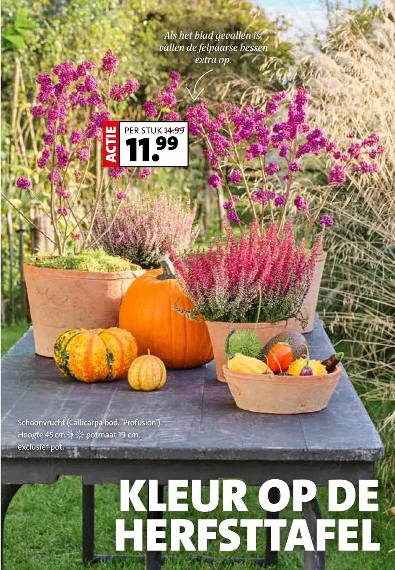 In de herfst wil je je huis gezellig maken met sfeervolle decoraties. Deze prachtige Schoonvrucht (Callicarpa bod. 'Profusion') biedt een schitterende toevoeging aan jouw herfsttafels. De levendige paarse bessen zorgen voor een sprankelende kleur in je huis of tuin, vooral in deze periode waarin de dagen korter worden. Met deze aanbieding van maar €11,99 in plaats van €14,99, kun je nu profiteren van deze stijlvolle plant tegen een gereduceerde prijs!