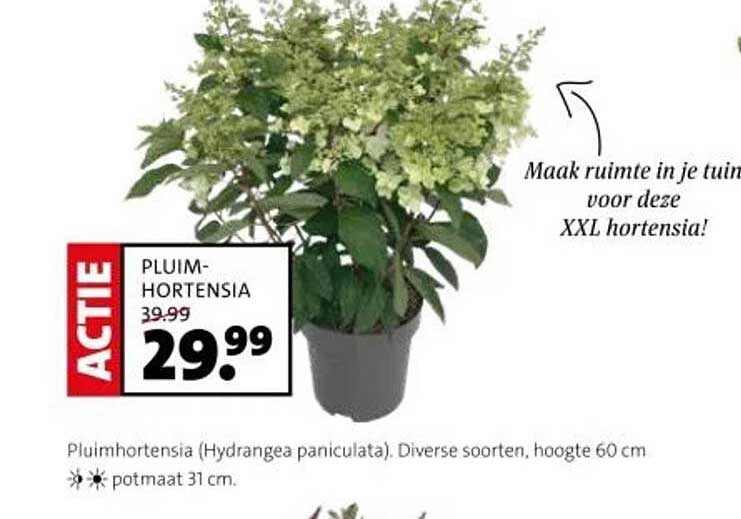 Ben je op zoek naar een prachtige aanwinst voor jouw tuin? Dan moet je zeker eens kijken naar de Pluimhortensia! Deze prachtige plant, ook wel bekend als Hydrangea paniculata, is een echte blikvanger en kan de schoonheid van je buitenruimte aanzienlijk verhogen. Met een aantrekkelijke prijs van slechts €29,99 in plaats van €39,99, is dit hét moment om je tuin op te fleuren met deze XXL hortensia. Waarom zou je deze kans niet grijpen?