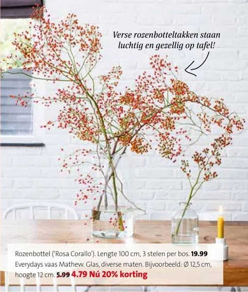 Normaal gesproken kosten de rozenbottel takken €5,99, maar nu zijn ze in de aanbieding voor slechts €4,79. Dat is een korting van maar liefst 20%! Dit is een geweldige kans om jouw interieur op te fleuren voor een lage prijs. Mis deze kans niet, want de aanbieding is geldig van 12 oktober tot en met 19 oktober 2025.