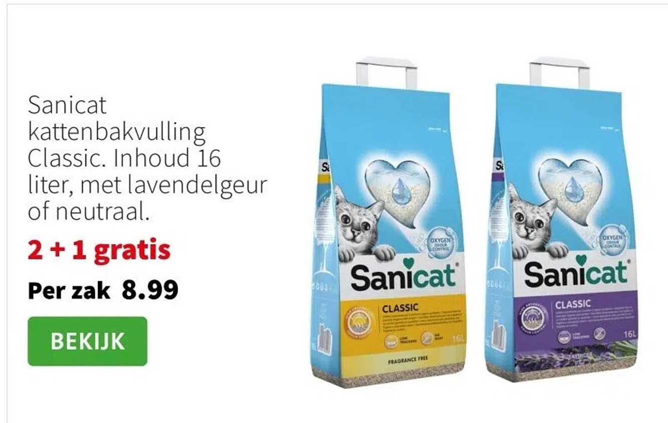 Bekijk nu de Sanicat kattenbakvulling Classic. Inhoud 16 liter, met lavendelgeur of neutraal. aanbieding in de Intratuin folder. Deze aanbieding is geldig van 30-06-2025 tot en met 06-07-2025.