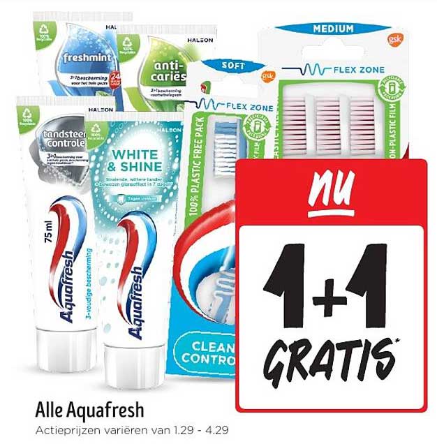 Maak je mondverzorging compleet met de geweldige aanbieding van Aquafresh! Van 30 april tot en met 6 mei heb je de kans om te profiteren van de 1+1 gratis actie op alle Aquafresh producten. Dit is het perfecte moment om je favoriete tandpasta's en tandenborstels te kopen en je mondgezondheid een flinke boost te geven.