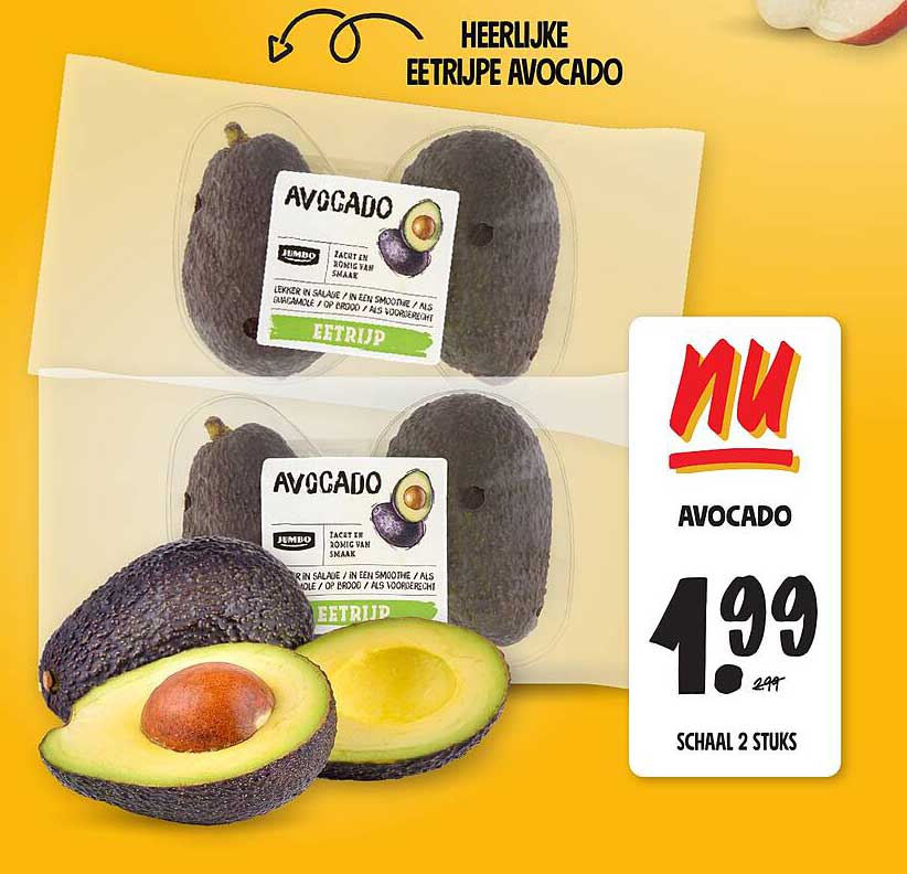 Bekijk de Avocado aanbieding bij Jumbo! Deze fantastische aanbieding is nu beschikbaar in de nieuwste Jumbo folder. Profiteer van deze kans en bespaar flink op je aankoop.