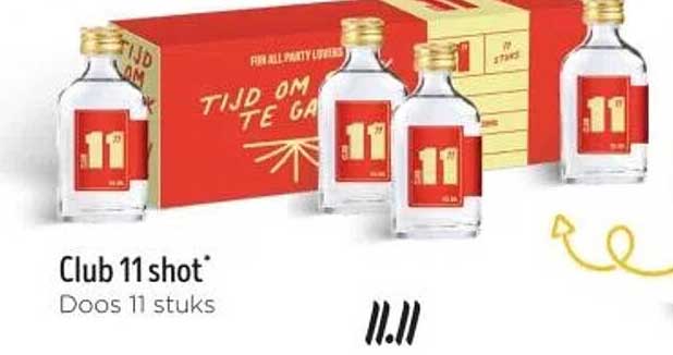 Bekijk nu de Club 11 shot* aanbieding in de Jumbo folder. Deze aanbieding is geldig van 26-02-2025 tot en met 04-03-2025.
