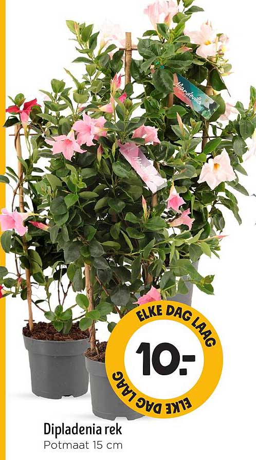 Normaal gesproken ligt de prijs van de Dipladenia rek hoger, maar met deze aanbieding zijn de kosten gereduceerd naar slechts €10,-. Dit betekent dat je niet alleen een prachtige plant aanschaft, maar ook flink bespaart. Een perfecte gelegenheid om je tuin of balkon op te fleuren zonder je budget te overschrijden!