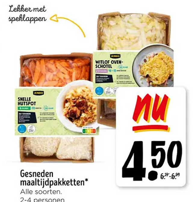 Bekijk de Gesneden Maaltijdpakketten* aanbieding bij Jumbo! Deze fantastische aanbieding is nu beschikbaar in de nieuwste Jumbo folder. Profiteer van deze kans en bespaar flink op je aankoop.