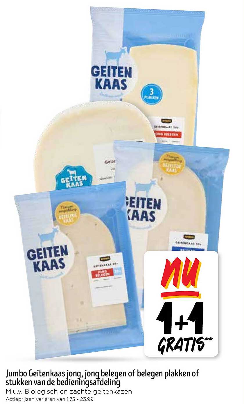 Bekijk nu de Jumbo Geitenkaas jong, jong belegen of belegen plakken of stukken van de bedieningsafdeling aanbieding in de Jumbo folder. Deze aanbieding is geldig van 19-03-2025 tot en met 25-03-2025.