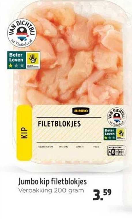 Heerlijk en vers: de Jumbo kip filetblokjes zijn een uitstekende keuze voor een snelle en smakelijke maaltijd. Of je nu een doorgewinterde kok bent of gewoon een drukke week hebt, deze malse stukjes kip maken het bereiden van een gezonde maaltijd uiterst eenvoudig. Met een aanbieding van slechts €3,59 voor 200 gram is dit echt een kans die je niet wilt missen!