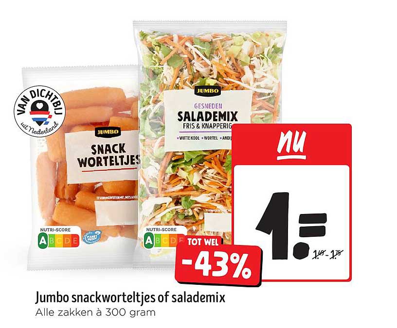 Bekijk nu de Jumbo snackworteltjes of saladmix aanbieding in de Jumbo folder. Deze aanbieding is geldig van 22-10-2025 tot en met 28-10-2025.