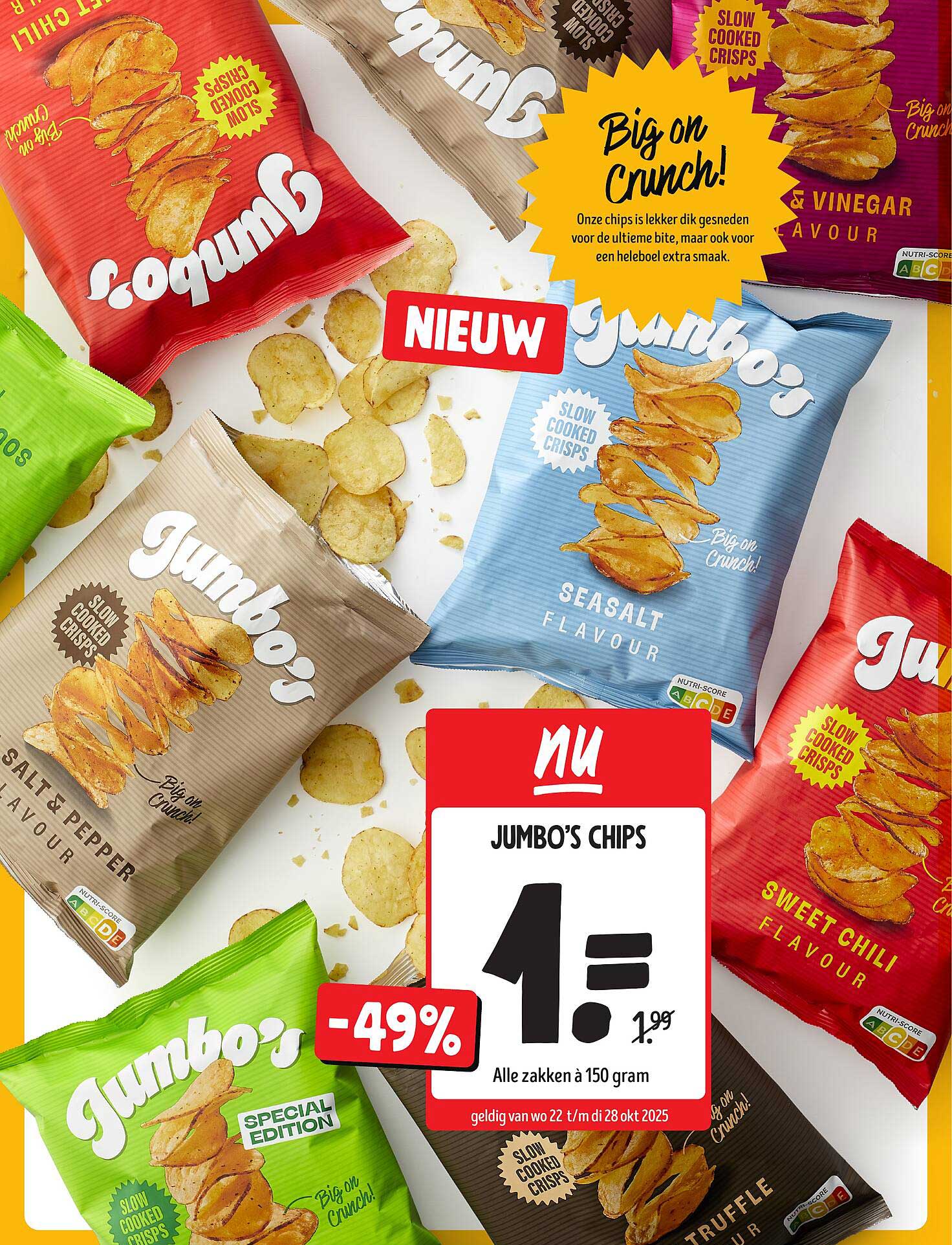 Bekijk nu de JUMBO'S CHIPS aanbieding in de Jumbo folder. Deze aanbieding is geldig van 22-10-2025 tot en met 28-10-2025.