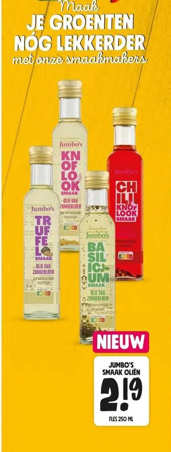 Ontdek de geweldige Jumbo's Smaak Oliën aanbieding in de nieuwste Jumbo folder. Naast deze aanbieding vind je nog veel meer aantrekkelijke kortingen. Je kunt de Jumbo's Smaak Oliën eenvoudig online bestellen via de Jumbo website of kopen in een winkel bij jou in de buurt.