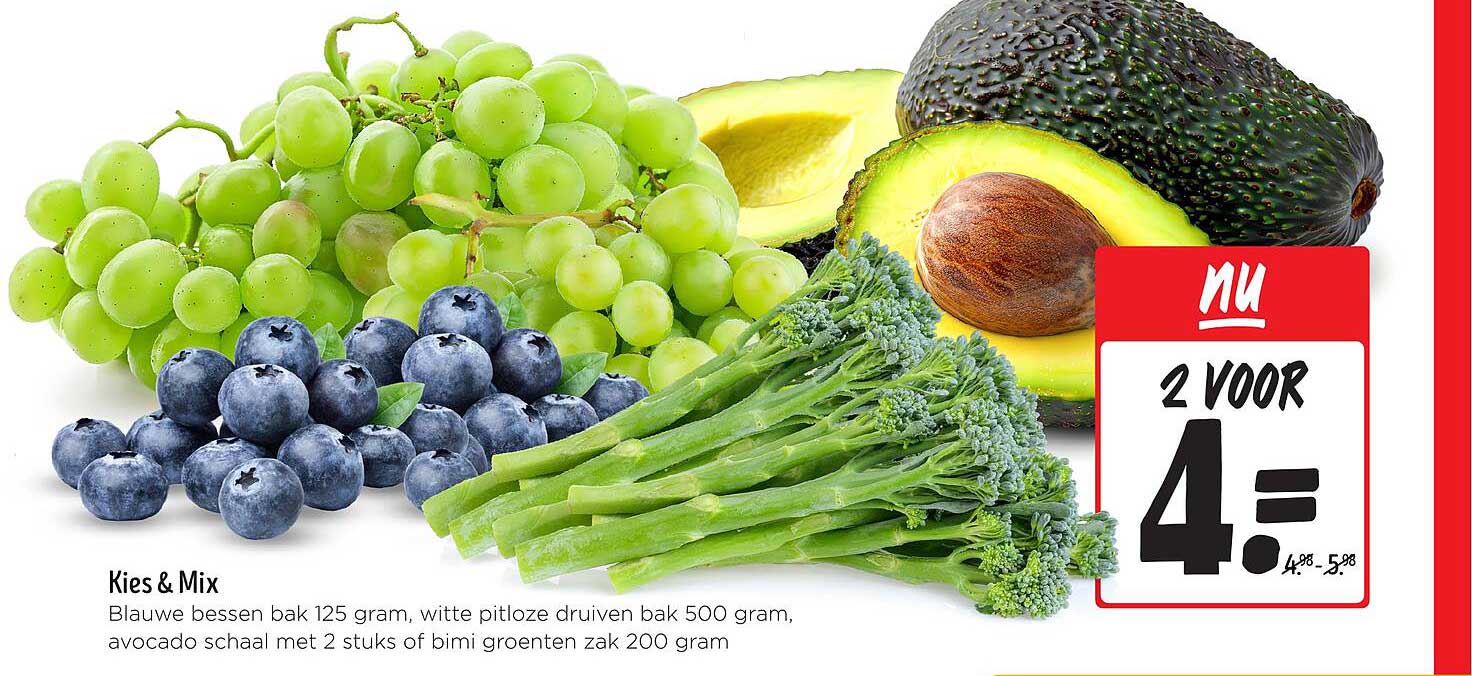 Deze aanbieding is perfect voor wie van gezonde voeding houdt. Met de Kies & Mix actie krijg je de kans om te genieten van vers fruit en groenten met een aantrekkelijke korting. Van sappige blauwe bessen tot knapperige broccoli, deze combinatie biedt niet alleen volop smaak, maar ook de voedingsstoffen die je lichaam nodig heeft.