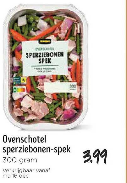 Bekijk de Ovenschotel Sperziebonen-Spek aanbieding bij Jumbo! Deze fantastische aanbieding is nu beschikbaar in de nieuwste Jumbo folder. Profiteer van deze kans en bespaar flink op je aankoop.