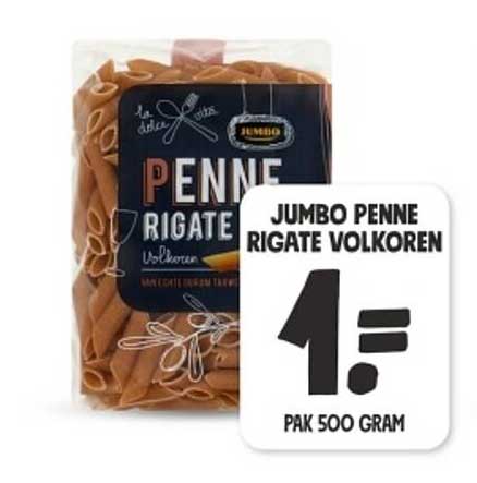 Bekijk de Penne Rigate Volkoren aanbieding bij Jumbo! Deze fantastische aanbieding is nu beschikbaar in de nieuwste Jumbo folder. Profiteer van deze kans en bespaar flink op je aankoop.