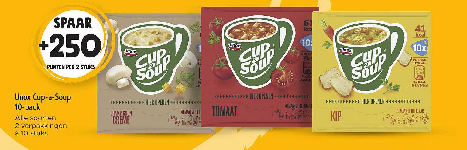 Bekijk nu de Unox Cup-a-Soup 10-pack aanbieding in de Jumbo folder. Deze aanbieding is geldig van 25-09-2024 tot en met 01-10-2024.