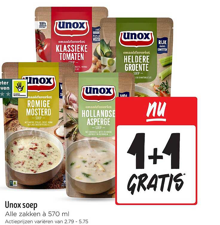 Maak je maaltijden compleet met de heerlijke Unox soep! Deze aanbieding biedt je de mogelijkheid om niet alleen te genieten van een smakelijk gerecht, maar ook een extra zak soep gratis te ontvangen. Een uitgelezen kans om je voorraad aan te vullen, zeker met de naderende koudere dagen. De Unox soepen zijn geliefd door hun rijke smaak en kwaliteit, waardoor ze perfect zijn voor zowel een snelle lunch als een verzorgd diner.