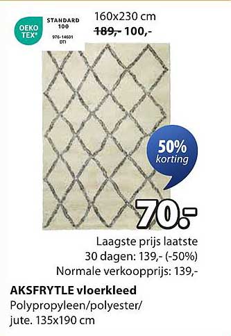 Bekijk nu de AKSFRYTL vloerkleed aanbieding in de Jysk folder. Deze aanbieding is geldig van 23-06-2025 tot en met 06-07-2025.