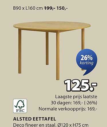 De normale verkoopprijs van de ALSTED EETTAFEL is €169,-, maar met de huidige aanbieding van €125,- bespaar je maar liefst €44,-! Dit is een geweldige kans om een kwaliteitsproduct in huis te halen zonder je budget te overschrijden.