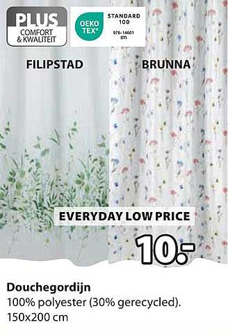 Vergeleken met de gemiddelde prijs van douchegordijnen in de markt, is €10 een onweerstaanbare aanbieding! Normaal gesproken vind je vergelijkbare producten voor een hogere prijs, maar bij Jysk krijg je nu de kans om met dit product te besparen. Dit zorgt ervoor dat je zonder twijfel de juiste keuze maakt voor zowel je portemonnee als je badkamer.