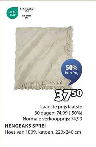 De normale verkoopprijs van de Hengeaks Sprei is €74,99, maar dankzij deze aanbieding van 50% korting kun je hem nu kopen voor slechts €37,50. Dit is een geweldige kans om hoogwaardige slaapkameraccessoires te kopen tegen een fractie van de prijs. Wacht niet te lang, want zulke aanbiedingen zijn vaak snel weg!