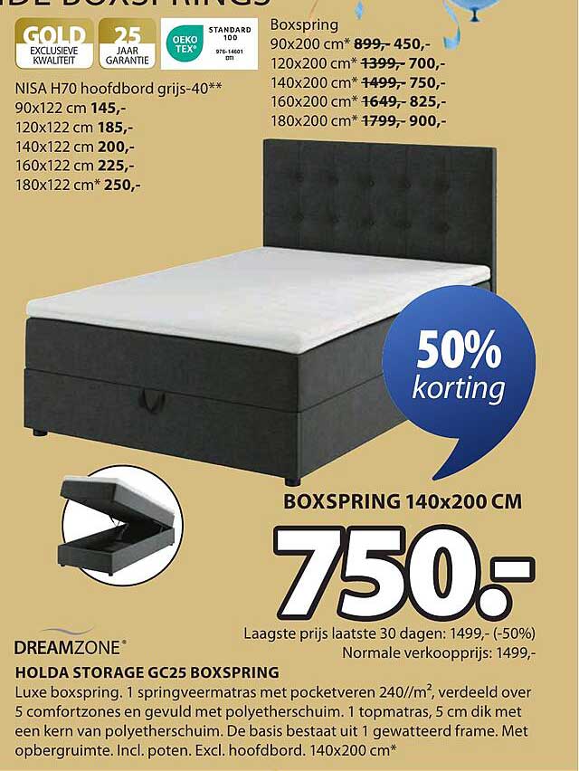 Ben je op zoek naar de perfecte boxspring om jouw slaapkamer helemaal compleet te maken? Dan is deze aanbieding van Jysk echt iets voor jou. Met een geweldige korting van 50%, krijg je nu de HOLA STORAGE GC25 BOXSPRING voor slechts €750 in plaats van de gebruikelijke €1499. Dit is dé kans om te investeren in een hoogwaardig bed dat niet alleen comfort biedt, maar ook een elegante uitstraling heeft.