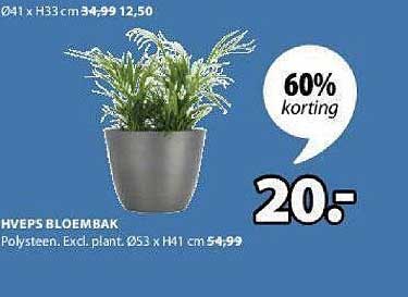 Bekijk nu de HVEPS BLOEMBAK aanbieding in de Jysk folder. Deze aanbieding is geldig van 23-03-2025 tot en met 06-04-2025.