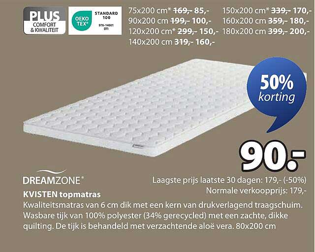 Met een normale verkoopprijs van €179, is het nu mogelijk om deze topmatras te kopen voor slechts €90! Dit is een geweldige kans om je slaapkamer te upgraden zonder je budget te overschrijden. Vergelijk deze prijs met andere winkels, en je zult zien dat Jysk de beste deal biedt!