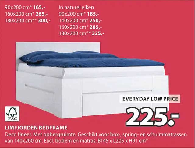 Als je op zoek bent naar een stijlvol en praktisch bedframe dat niet alleen mooi is, maar ook functioneel, dan is deze aanbieding van Jysk precies wat je nodig hebt! Het Limfjorden bedframe biedt een perfecte combinatie van uitstraling en opbergruimte. Dit is een geweldige kans om jouw slaapkamer naar een hoger niveau te tillen, vooral met de daarvoor geldende aanbieding.