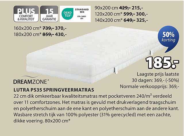 De huidige aanbieding laat je het matras voor slechts €185 verkrijgen, terwijl de normale verkoopprijs €369 is. Dit betekent een besparing van maar liefst €184! Met een korting van 50% is dit een uitgelezen kans om jouw slaapkamer een upgrade te geven zonder het budget te overschrijden.