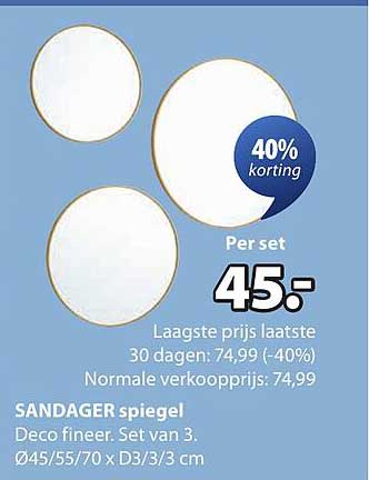 Als je op zoek bent naar een stijlvolle en praktische toevoeging aan je interieur, dan is deze aanbieding van de Jysk-folder perfect voor jou. De SANDAGER spiegel is niet alleen functioneel, maar ook een echte blikvanger in elke ruimte. Met drie verschillende formaten in één set, kun je eindeloos combineren en creëren. En met een korting van 40% is dit de ideale tijd om jouw woning een make-over te geven!