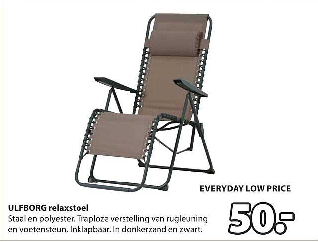 Met een actieprijs van slechts €50, is de ULFborg relaxstoel een buitenkans. Vergelijk dit eens met andere relaxstoelen op de markt en je zult snel zien dat dit een zeer aantrekkelijke prijs is voor een product van deze kwaliteit. Deze aanbieding loopt maar tot en met 1 juni, dus mis het niet!
