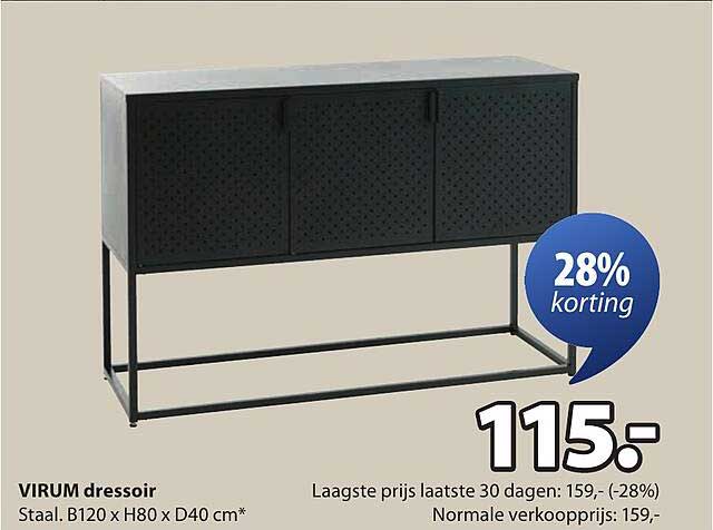 De dressoir is nu beschikbaar voor slechts 115,-, wat je een prachtige korting van 28% oplevert ten opzichte van de normale verkoopprijs van 159,-. Dit maakt het kopen van de VIRUM dressoir niet alleen een slimme keuze voor je interieur, maar ook voor je portemonnee. Dit is de perfecte gelegenheid om je ruimte een opfrisbeurt te geven zonder je budget te overschrijden.