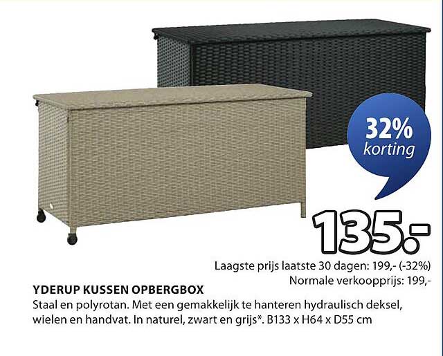 Met een normale verkoopprijs van €199,00 is de YDERUP kussen opbergbox nu tijdelijk verkrijgbaar voor slechts €135,00. Dit betekent een besparing van €64,00! Dit is een uitstekende kans om een hoogwaardig product aan te schaffen voor een fractie van de prijs. Mis deze aanbieding niet, want de campagne loopt maar tot en met 13 april 2025!