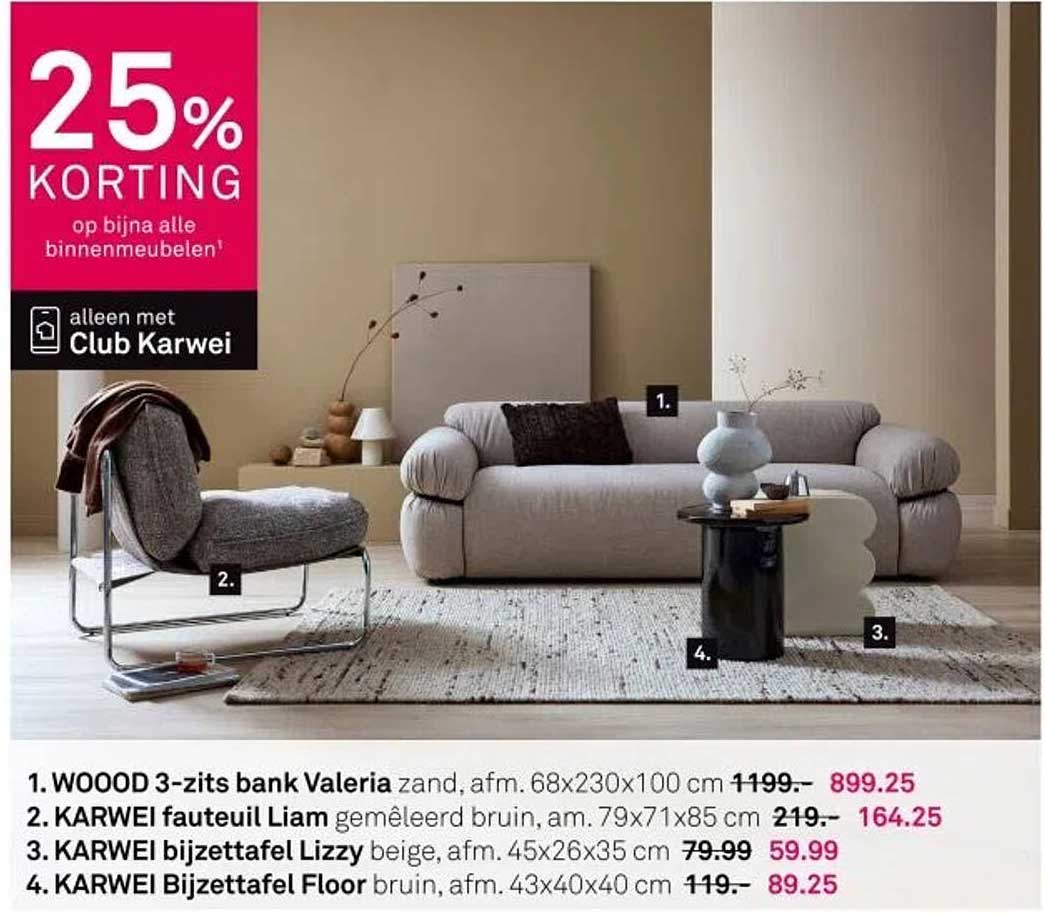 Met de huidige actieprijs van €899,25 voor de WOOD bank Valeria in plaats van de normale prijs van €1199,- bespaar je maar liefst €299,75. Ook de andere meubels zijn scherp geprijsd. De KARWEI fauteuil Liam kost nu €164,25, terwijl deze eerder €219,- was. Dit zijn kortingen die je niet wilt missen!