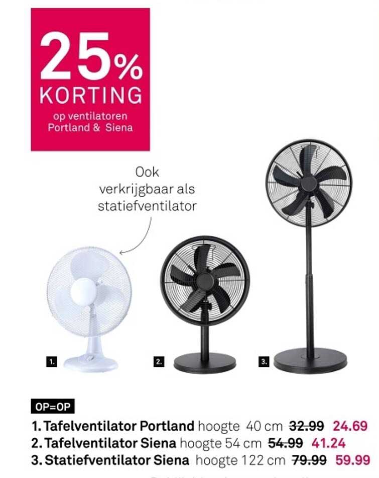 Met de huidige aanbieding kun je de tafelventilator Portland kopen voor slechts €24,69 in plaats van de normale prijs van €32,99. Ook de tafelventilator Siena is nu beschikbaar voor €41,24, terwijl deze normaal €54,99 kost. De statiefventilator Siena, met een grote korting, is nu te verkrijgen voor €59,99 in plaats van €79,99. Dit is de perfecte gelegenheid om jezelf en je huis te verwennen met koelte tijdens de hete dagen.