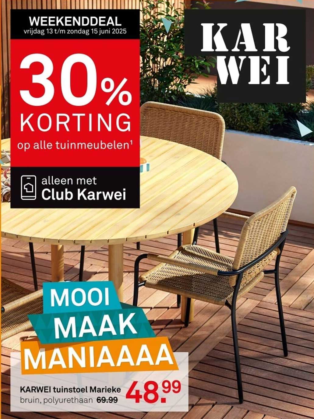 Bekijk nu de 30% KORTING op alle tuinmeubelen aanbieding in de Karwei folder. Deze aanbieding is geldig van 13-06-2025 tot en met 15-06-2025.