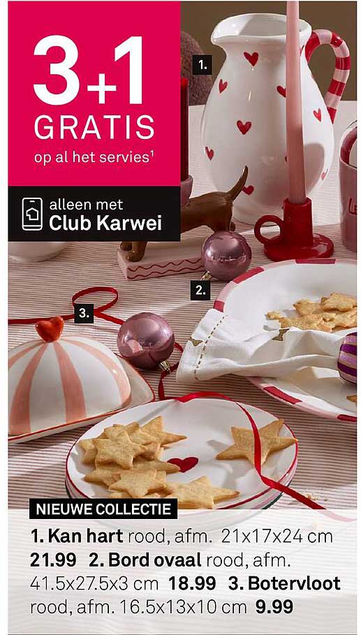 De feestdagen komen eraan en wat is er leuker dan een mooie tafel dekken met stijlvol servies? Bij Karwei krijg je nu een ongelooflijke aanbieding: bij aankoop van 3 serviesartikelen, krijg je de vierde GRATIS! Dit is de perfecte gelegenheid om je servies collectie uit te breiden en je gasten te verrassen met een prachtig gedekte tafel.