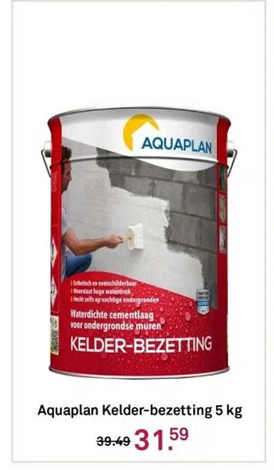 Heb je last van vochtige muren in je kelder of ondergrondse ruimtes? Dan is de Aquaplan Kelder-betrekking de oplossing voor jou! Deze waterdichte cementlaag beschermt je muren tegen vocht en zorgt ervoor dat je kelder veilig en droog blijft. Met deze aanbieding kun je deze effectieve oplossing nu voor een lager prijsje aanschaffen. Perfect voor klussers die een vochtvrij huis willen!