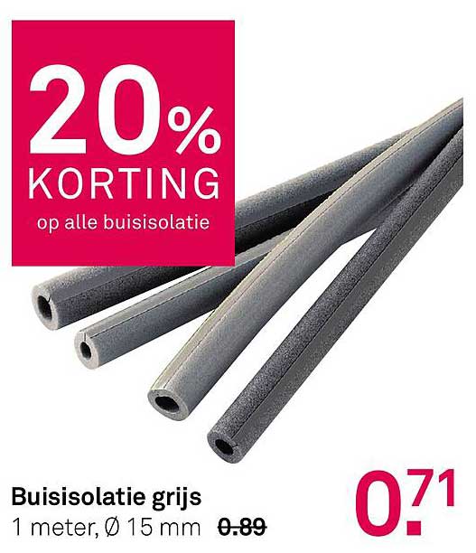 Normaal gesproken kost deze buisisolatie €0,89 per meter, maar tijdens deze aanbieding koop je hem voor slechts €0,71! Dit bespaart je €0,18 per meter, wat een mooie korting van 20% betekent. Het is de perfecte gelegenheid om je huis beter te isoleren zonder een groot budget te hoeven besteden.