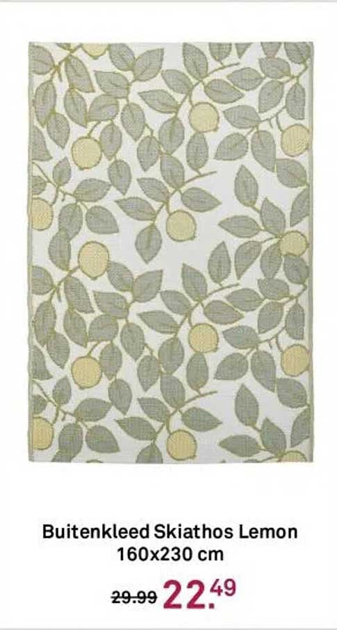 Het Buitenkleed Skiathos Lemon heeft een afmeting van 160x230 cm, perfect voor de meeste buitenruimtes. Het ontwerp met bladeren en citroenen geeft een speelse en frisse uitstraling. Gemaakt van hoogwaardige vezels, is het kleed niet alleen mooi, maar ook sterk en slijtvast.