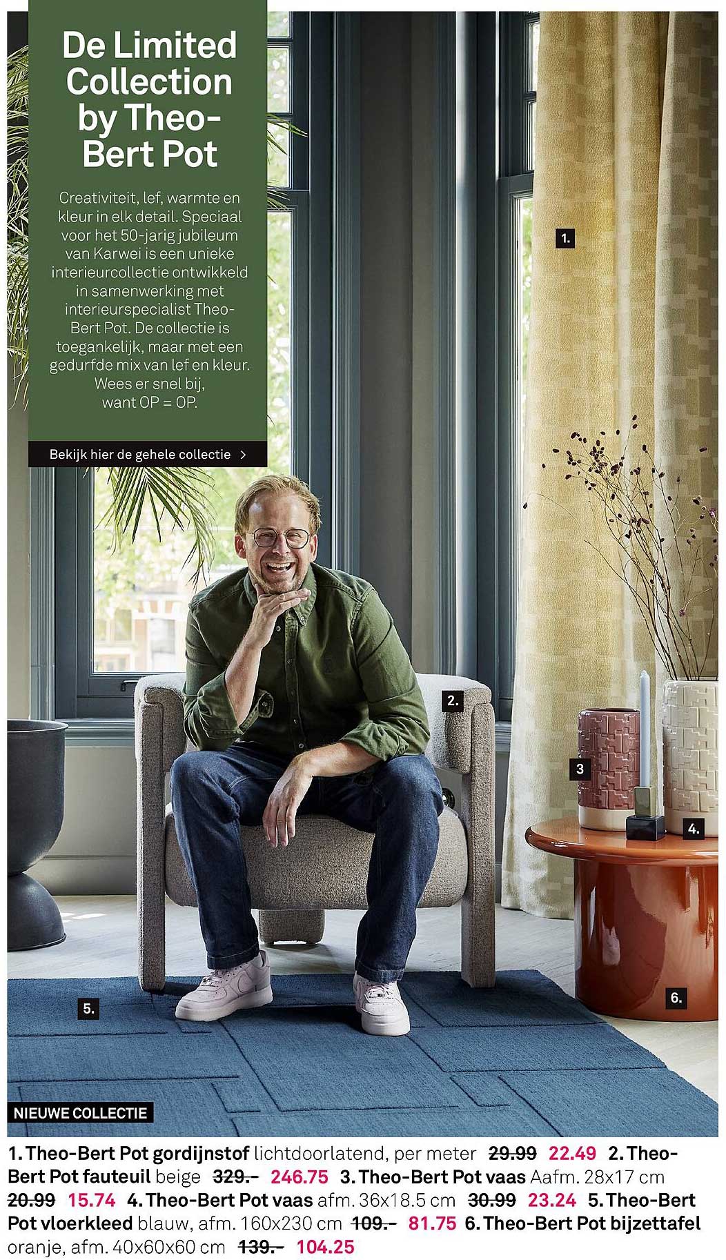 Ontdek de unieke "De Limited Collection by Theo-Bert Pot" bij Karwei. Deze serie, ontwikkeld ter gelegenheid van het 50-jarig jubileum van Karwei, biedt een prachtige mix van creativiteit, lef, warmte en kleur. Of je nu je woonkamer wilt opfrissen of een ontspannen sfeer wilt creëren, deze collectie heeft iets voor elke stijl en smaak.