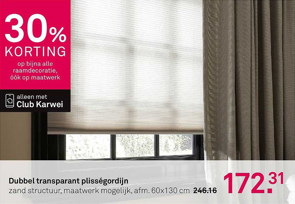 Ben je op zoek naar een stijlvolle en functionele manier om je ramen te decoreren? Kijk dan hier! Het dubbel transparant plisségordijn is precies wat je nodig hebt om sfeer en comfort in jouw interieur te brengen. Met 30% korting, alleen voor leden van Club Karwei, is het nu de beste tijd om deze prachtige raambekleding aan te schaffen.