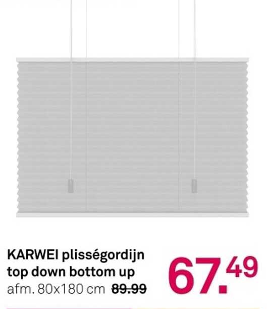Bekijk de Karwei Plisségordijn Top Down Bottom Up aanbieding bij Karwei! Deze fantastische aanbieding is nu beschikbaar in de nieuwste Karwei folder. Profiteer van deze kans en bespaar flink op je aankoop.