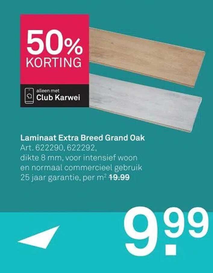 Bekijk nu de Laminaat Extra Breed Grand Oak aanbieding in de Karwei folder. Deze aanbieding is geldig van 24-03-2025 tot en met 04-04-2025.